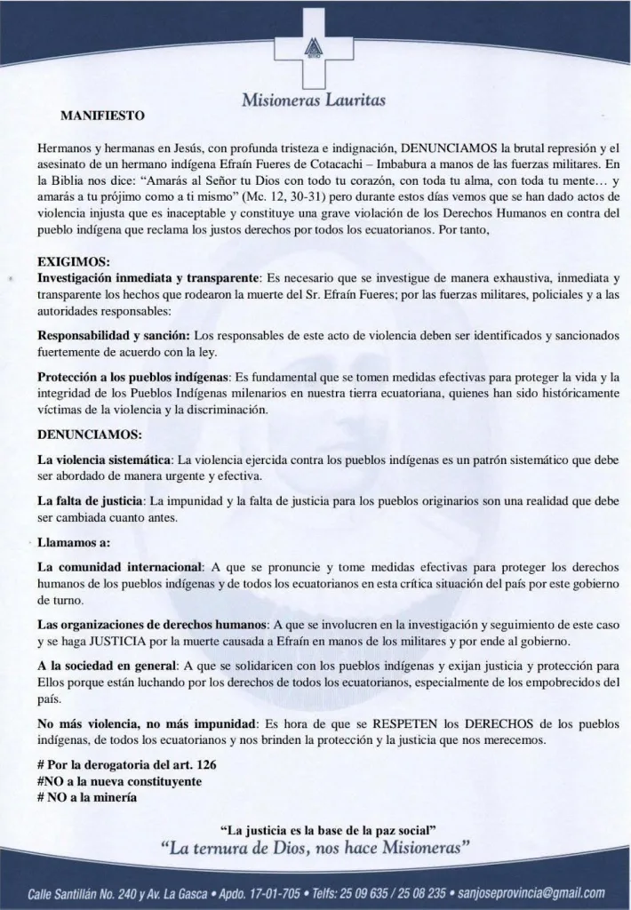 Hermanos y hermanas en Jesús, con profunda tristeza e indignación, DENUNCIAMOS la brutal represión y el asesinato de un hermano indígena Efraín Fueres de Cotacachi — Imbabura a manos de las fuerzas militares. En la Biblia nos dice: “Amarás al Señor tu Dios con todo tu corazón… y amarás a tu prójimo como a ti mismo” (Mc. 12, 30-31) pero durante estos días vemos que se han dado actos de violencia injusta que es inaceptable y constituye una grave violación de los Derechos Humanos en contra del pueblo indígena que reclama los justos derechos por todos los ecuatorianos. Por tanto,